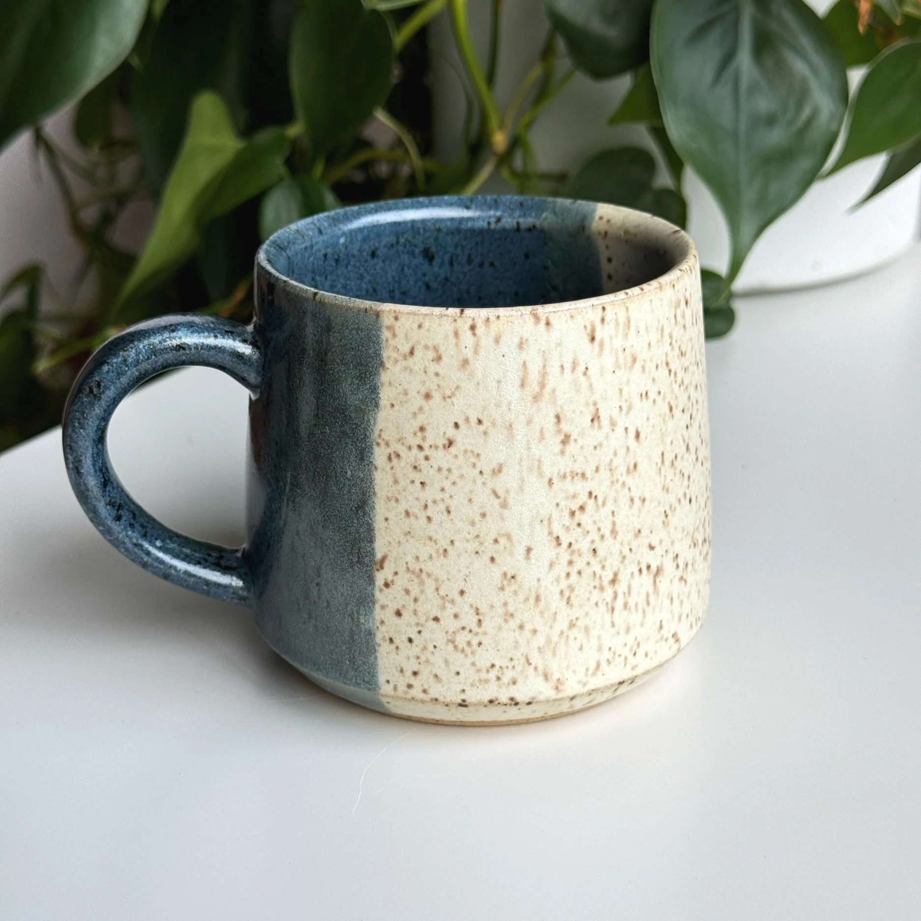 Wheel thrown handmade mug, with trimmed foot and pulled handle. Made with stoneware clay M340s. Finished in a half dip of white and blue glaze.